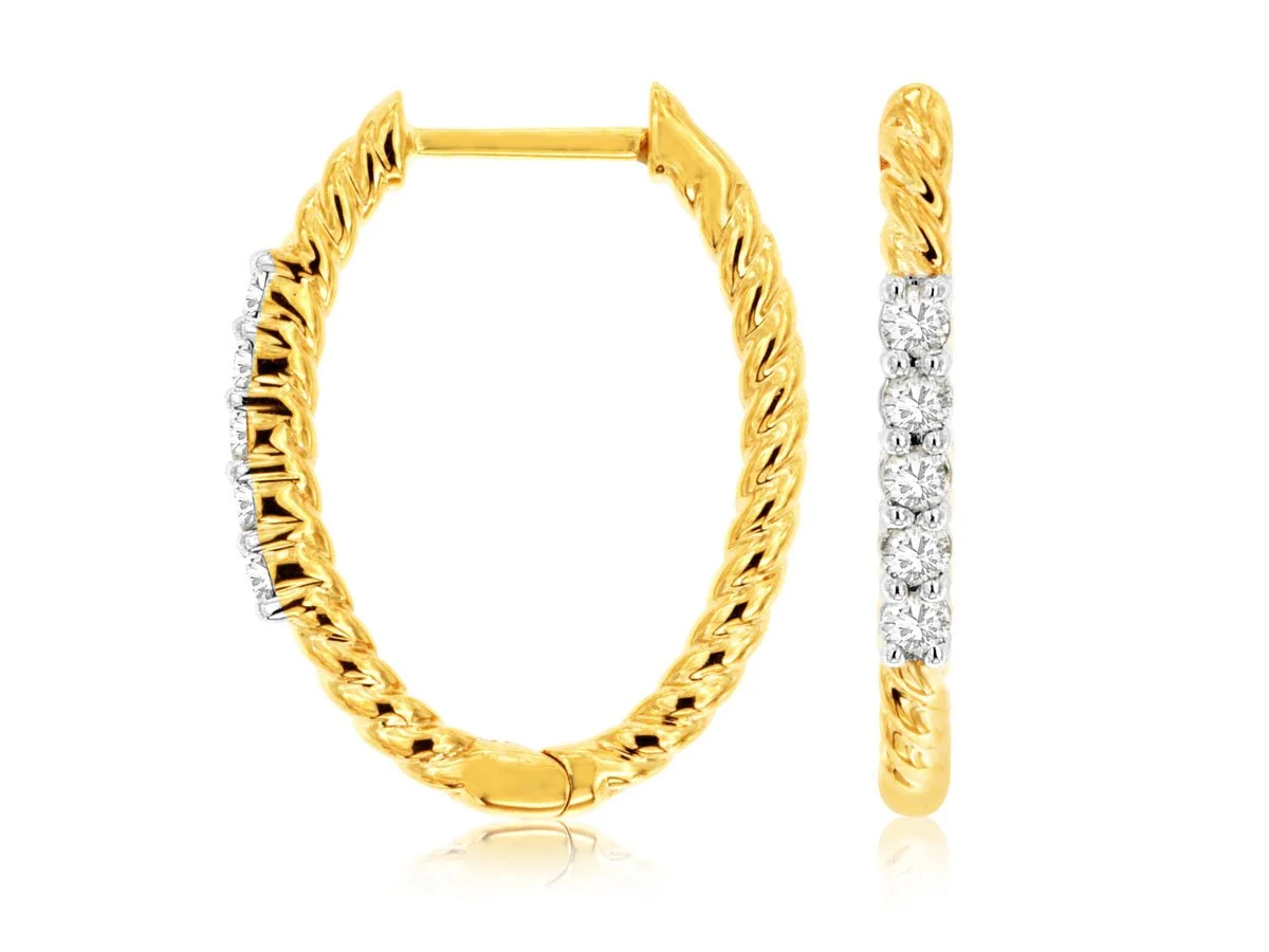 14k Yellow Gold Baguette and Round Diamond Hoop Earrings